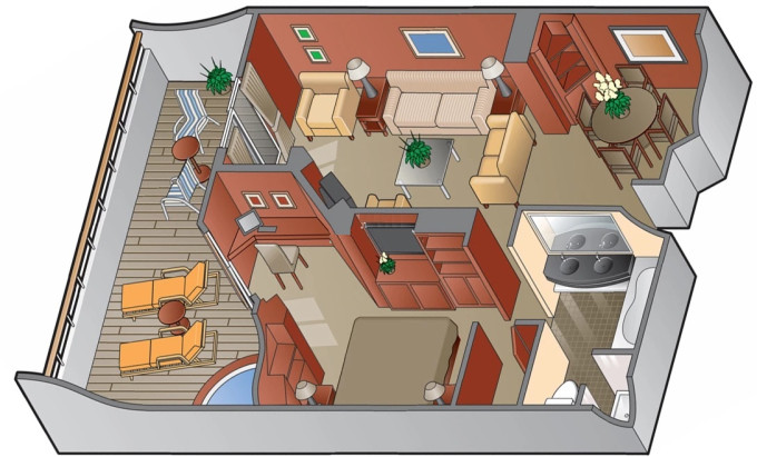 | CS - Celebrity Suite 43 m² + balkón 8 m². Kúpeľňa s vírivkou. 6. až 9. paluba stred. Max 3 osoby. Výhody Suite The Retreat. | 6 424 € 3 212 € za osobu | ||